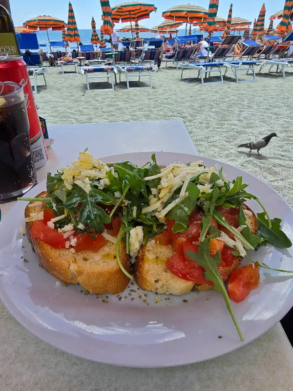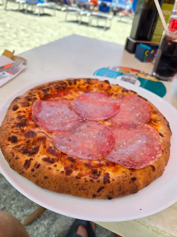 해변에서의 식사는 특별한 경험입니다. 스텔라 마리나에서는 맛있는 음식과 음료를 즐길 수 있습니다. 특히 살라미 피자는 놓쳐서는 안 될 메뉴입니다. 완벽한 도우 위에 바삭하게 구워진 모짜렐라 치즈와 살라미의 조화는 환상적입니다. 아내가 주문한 브루스케타 역시 신선한 토마토와 바질이 듬뿍 올려져 있어 훌륭한 맛을 자랑합니다. 시원한 아페롤 스프리츠 한 잔과 함께라면 더할 나위 없이 완벽한 식사를 즐길 수 있습니다.
