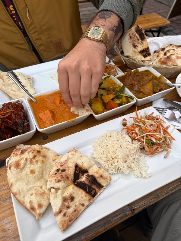 드디어 기다리고 기다리던 테이스팅 메뉴가 나왔다. 커다란 접시에는 다양한 인도 요리들이 푸짐하게 담겨 있었다. 버터 치킨, 탄두리 치킨, 각종 커리와 난, 밥, 샐러드까지, 보기만 해도 배가 불렀다.