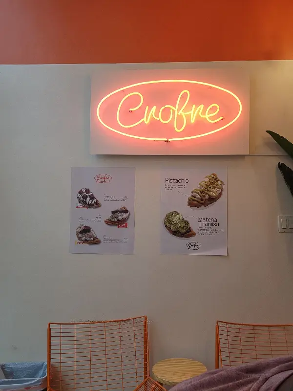 문을 열고 들어서자, 따뜻한 조명과 아늑한 분위기가 저를 맞이했습니다. 은은하게 퍼지는 달콤한 향기는 저절로 미소를 짓게 만들었죠. 벽면에 걸린 네온사인 간판이 눈에 띄었는데, 세련된 글씨체로 적힌 ‘Crofre’라는 상호명이 왠지 모르게 설렘을 더했습니다. 벽에는 크로플 사진과 메뉴가 보기 좋게 붙어있어, 주문하기 전부터 어떤 맛을 골라야 할지 행복한 고민에 빠졌습니다.