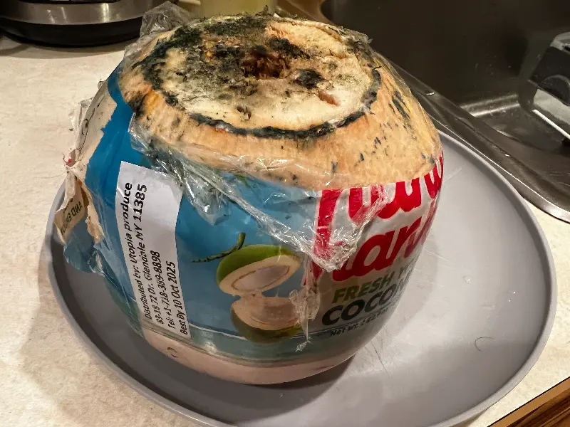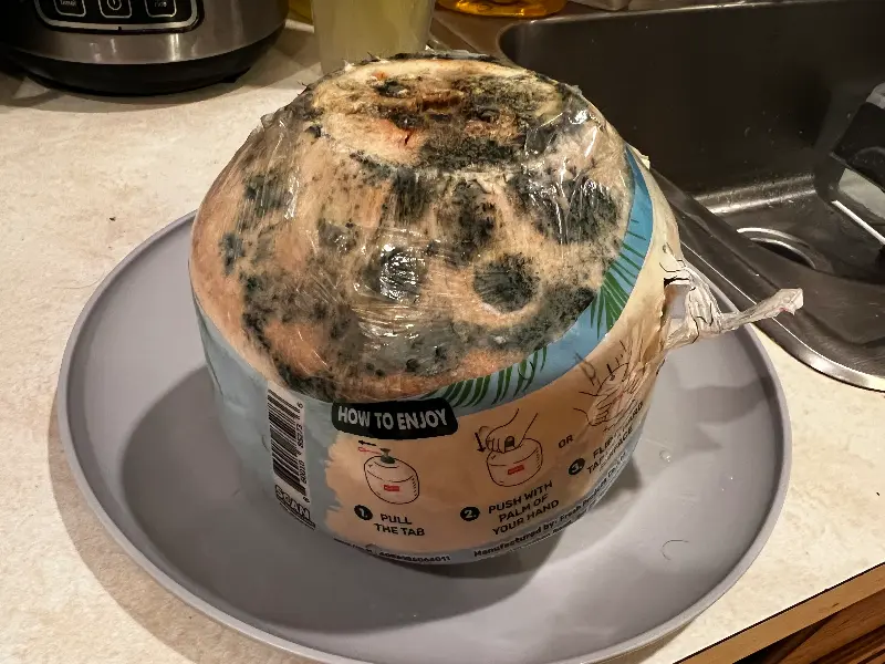 사진 속 코코넛 음료는 겉면에 곰팡이가 심하게 피어 있는 모습입니다. 이는 위생 관리에 대한 우려를 자아내며, 식품 안전에 대한 경각심을 일깨워 줍니다.