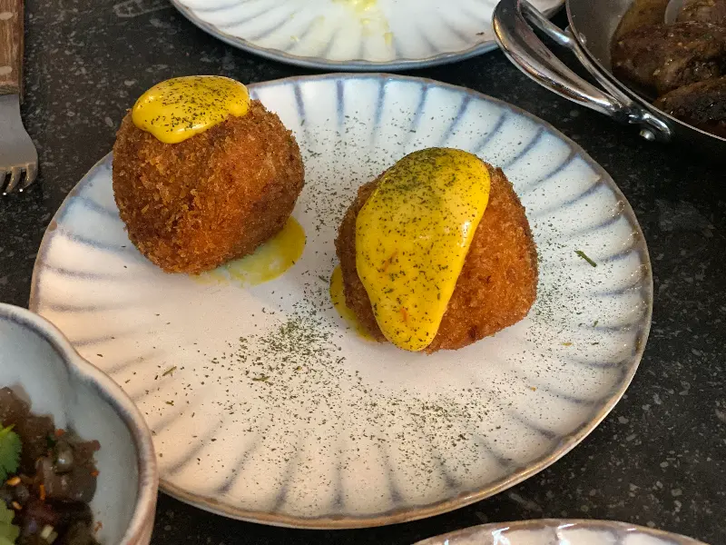 고민 끝에 몇 가지 메뉴를 주문했습니다. 가장 먼저 눈에 띈 것은 갑각류, 스캠피, 루이 소스가 들어간 아란치니였습니다. 겉은 바삭하고 속은 촉촉한 아란치니 볼을 한 입 베어 무니 입안 가득 퍼지는 크리미한 루이 소스의 풍미가 정말 훌륭했습니다. 사진에서 보이는 것처럼 속이 정말 촉촉하고 부드러웠습니다.