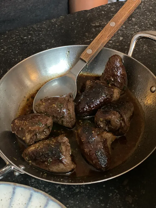 다음으로 도전한 메뉴는 오리 심장 요리였습니다. 낯선 식재료였지만, 쫄깃하면서도 부드러운 식감과 깊은 풍미에 놀라움을 금치 못했습니다. 겉은 살짝 튀겨져 바삭하고, 속은 촉촉하게 익혀져 있어 완벽한 조화를 이루었습니다.
