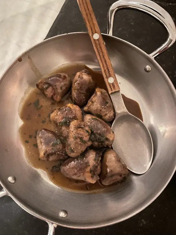 쫄깃하면서도 부드러운 식감이 일품인 오리 심장 요리. 독특한 풍미가 매력적이다.