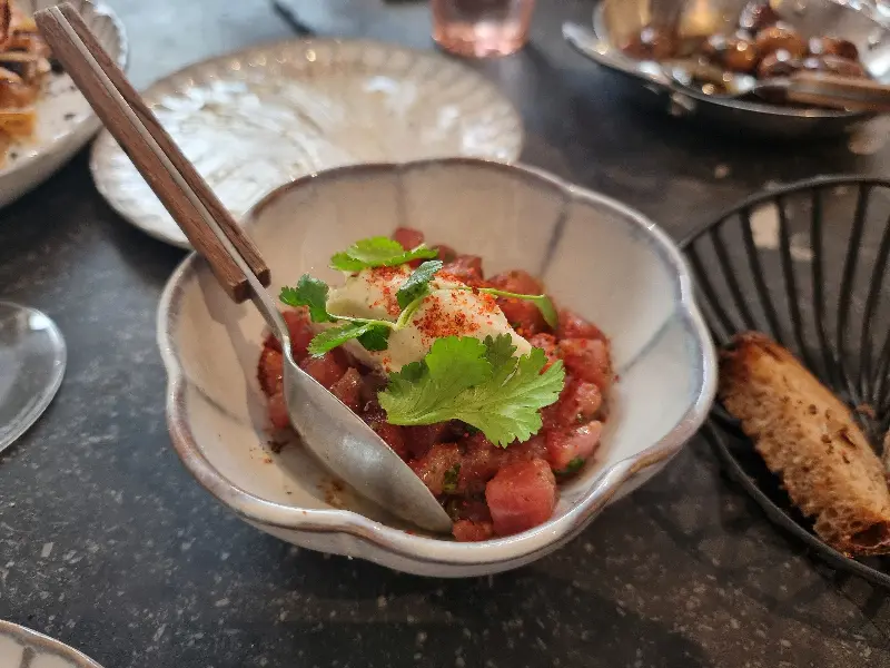 상큼한 맛으로 입가심을 하고 싶어 와사비 아이스크림을 곁들인 참치 타르타르를 주문했습니다. 신선한 참치와 와사비 아이스크림의 조화는 예상외로 훌륭했습니다. 특히, 더운 여름날에 상큼하고 시원하게 즐기기에 안성맞춤이었습니다.