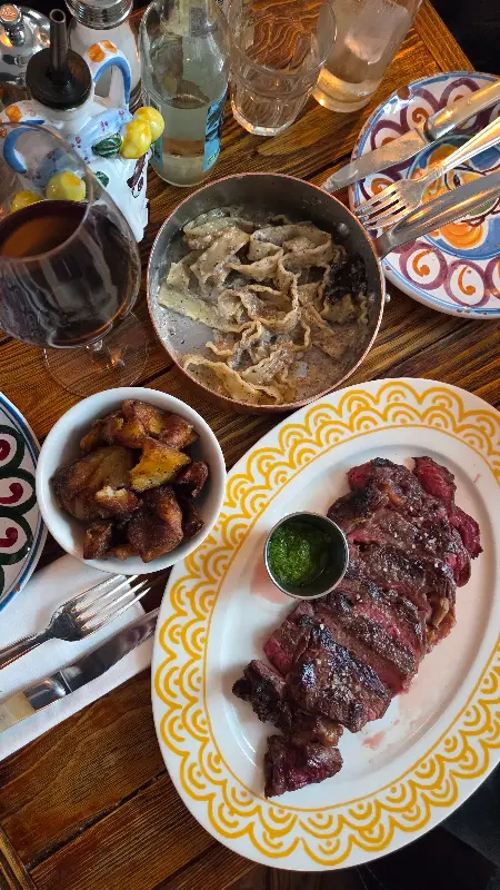 트러플 파스타와 함께 핑크맘마의 또 다른 대표 메뉴인 스테이크도 주문했습니다. 겉은 바삭하고 속은 촉촉하게 구워진 스테이크는 입 안에서 살살 녹는 듯한 부드러운 식감을 자랑합니다. 스테이크와 함께 제공되는 감자튀김 또한 빼놓을 수 없는 메뉴입니다. 겉은 바삭하고 속은 촉촉한 완벽한 겉바속촉의 감자튀김은, 짭짤하면서도 고소한 맛으로 스테이크와 환상적인 조화를 이룹니다. 스테이크 소스는 스테이크의 느끼함을 잡아주고 신선한 맛을 더해줍니다.