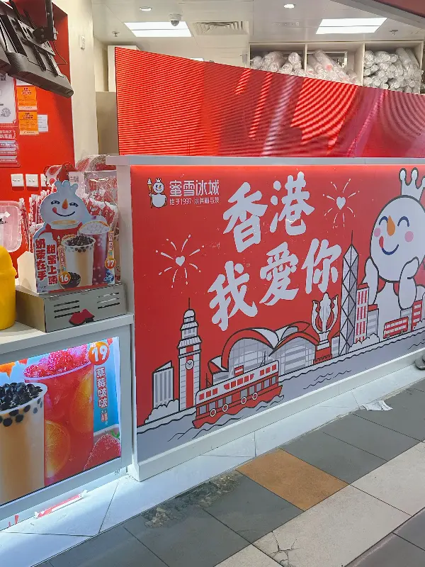 매장 앞에 다다르자, 강렬한 붉은색 인테리어가 시선을 사로잡았습니다. 마치 중국의 활기 넘치는 거리에 와있는 듯한 느낌이었죠. 벽면에는 “香港 我愛你 (홍콩, 사랑해)”라는 문구와 함께 홍콩의 랜드마크들이 귀여운 그림체로 그려져 있었습니다. Mixue의 마스코트인 눈사람 캐릭터도 크게 자리 잡고 있어, 친근하고 밝은 분위기를 더했습니다.