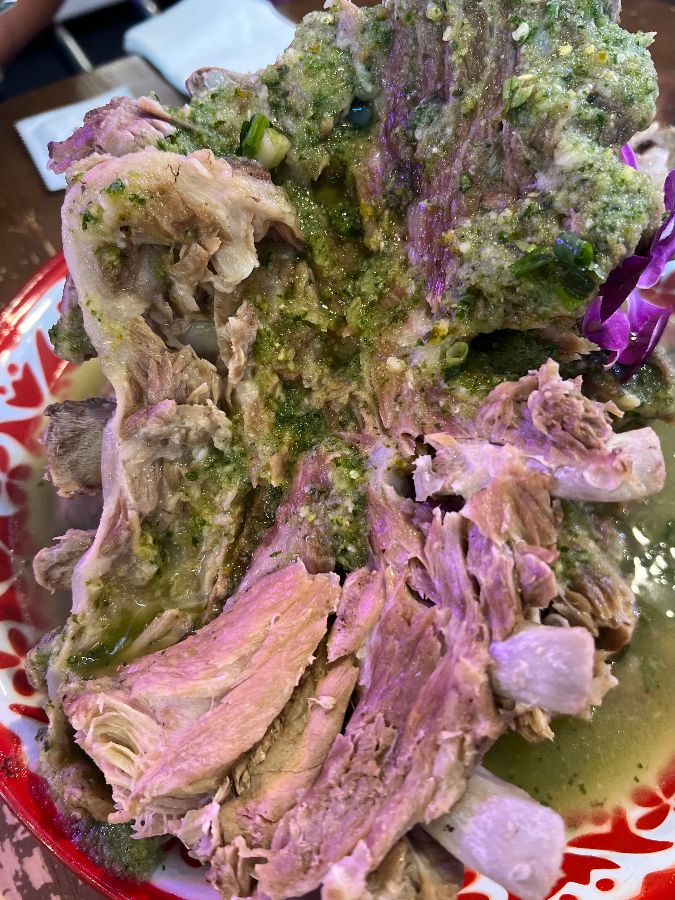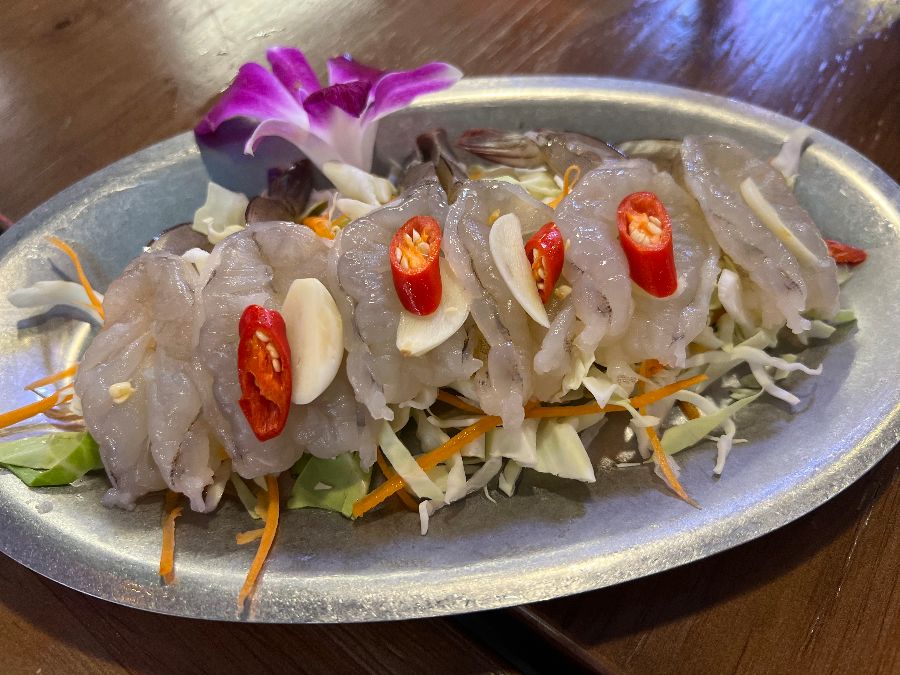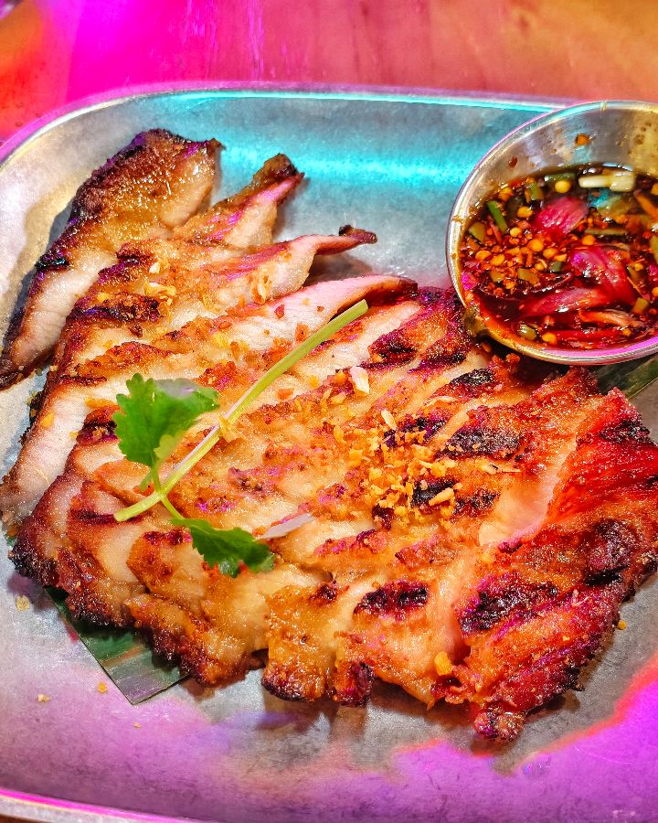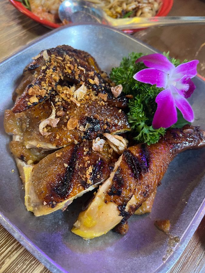 얼마 지나지 않아 주문한 요리들이 테이블 위로 하나둘씩 모습을 드러냅니다. 먼저 숯불에 구워낸 닭고기와 돼지고기 요리들이 시선을 사로잡습니다. ‘가이 양’을 연상시키는 구운 닭고기(Image 1)는 먹음직스러운 황금빛 껍질과 그릴 마크가 선명하고, 튀긴 마늘 후레이크가 넉넉히 뿌려져 있습니다. 향긋한 파슬리와 보라색 난꽃 장식은 눈을 즐겁게 합니다. 한 조각 집어 입에 넣으면, 겉은 바삭하고 속은 촉촉한 육즙이 터져 나오며 고소함이 입안 가득 퍼집니다. 일반적인 태국 음식점보다 풍미가 진하고 따뜻하며, 술과 더 잘 어울린다는 평처럼 숯불 향이 더해져 더욱 깊은 맛을 냅니다.