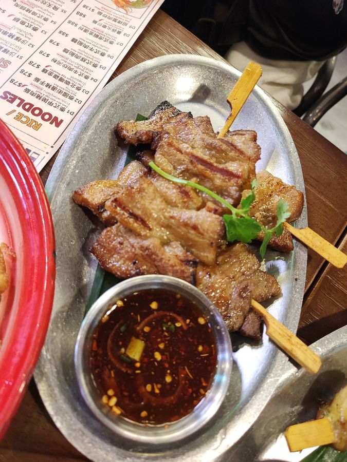 다음으로 등장한 구운 돼지고기 목살(Image 5) 역시 완벽한 굽기로 아름다운 그릴 자국을 뽐냅니다. 육즙 가득한 두툼한 목살은 씹을 때마다 고소함이 배어 나오고, 함께 제공되는 매콤새콤한 태국식 소스에 찍어 먹으면 감칠맛이 폭발합니다. 작은 나무 꼬치에 꿰어 나온 돼지고기 꼬치(Image 6)는 한입 크기로 즐기기 좋으며, 부드러운 식감이 인상적입니다. 이처럼 숯불 요리들은 강렬한 불맛과 진한 풍미로 식사의 시작을 화려하게 장식합니다.