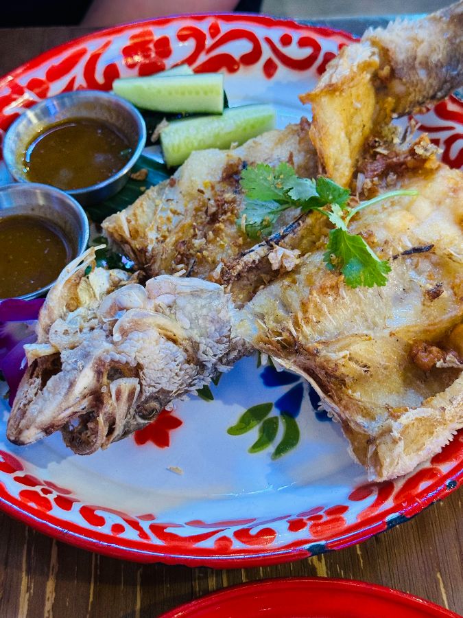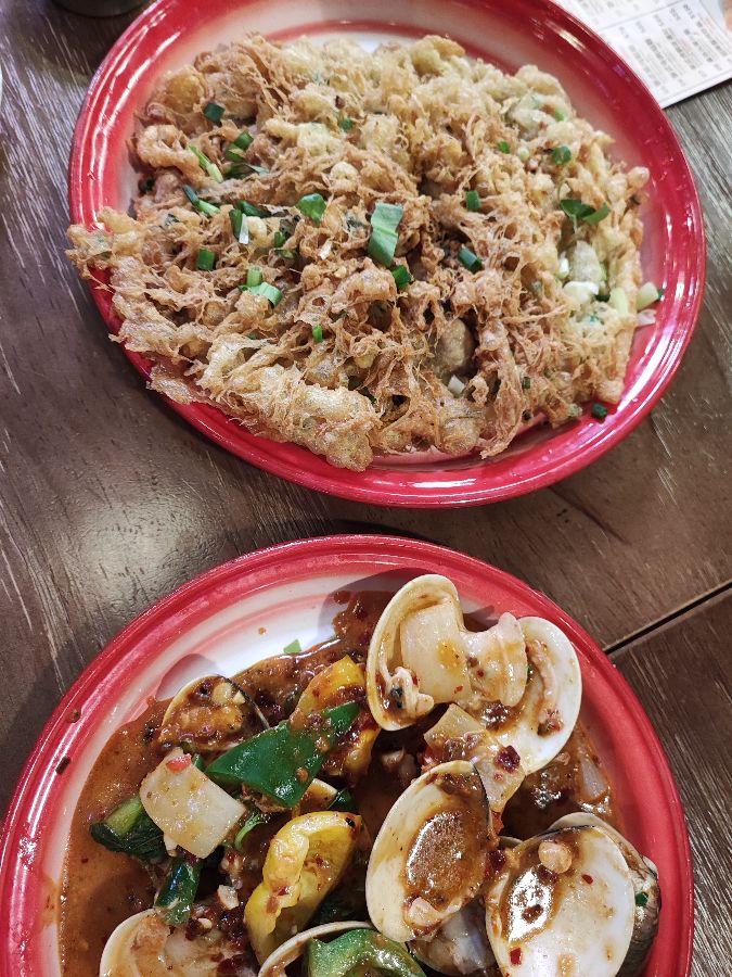 태국 음식에서 빼놓을 수 없는 해산물 요리도 타마린드의 자랑입니다. 통으로 튀겨낸 생선(Image 8)은 겉은 바삭하고 속은 촉촉하게 잘 익혀져 나옵니다. 태국 전통 문양이 새겨진 붉은색과 흰색의 트레이에 담겨 나오는 모습은 마치 현지 노점에서 갓 튀겨낸 듯한 생생함을 더합니다. 튀김옷은 과하지 않으면서도 생선의 맛을 그대로 살려주며, 함께 제공되는 매콤새콤한 소스에 찍어 먹으면 신선한 생선 맛이 한층 돋보입니다. 시원한 맥주나 태국식 음료와 함께 곁들이면 더욱 완벽한 조합입니다. 또 다른 해산물 요리로는 매콤한 소스에 볶아낸 조개 요리(Image 3 하단)가 있습니다. 탱글탱글한 조갯살과 아삭한 채소, 그리고 중독성 있는 매콤한 양념이 어우러져 밥반찬으로도, 술안주로도 훌륭합니다.