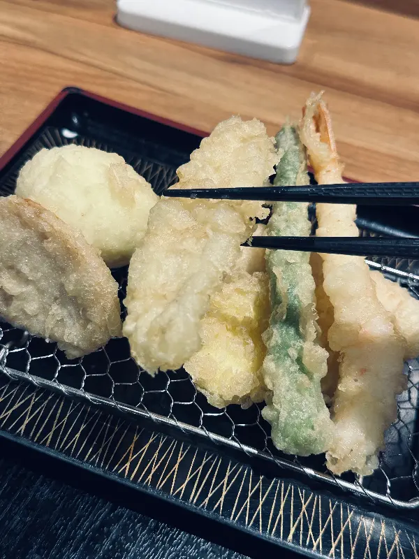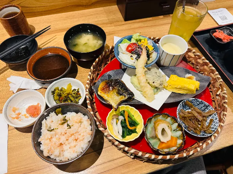 주문 후 얼마 지나지 않아 산카이 정식이 테이블 위에 놓였다. 튀김, 밥, 멘타이코, 따뜻한 차, 그리고 다양한 반찬들로 구성된 푸짐한 한 상 차림이었다. 갓 튀겨져 나온 튀김은 보기만 해도 바삭함이 느껴졌다. 새우, 생선, 닭고기 등 다양한 종류의 튀김이 정갈하게 담겨 있었다.