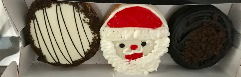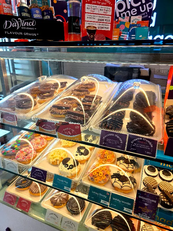 도넛 종류가 너무 많아 고민하고 있자니, 친절한 직원이 다가와 인기 메뉴를 추천해 주었다. 크리스마스 시즌 한정으로 출시된 “딸기 산타” 도넛과 초콜릿 마니아들을 위한 “오리지널 씬”, 그리고 “미드나잇 뷰티” 도넛이 특히 인기가 많다고 했다. 추천받은 메뉴들을 포함해 모듬 도넛 6개를 주문하고, 따뜻한 아메리카노 두 잔도 함께 주문했다.