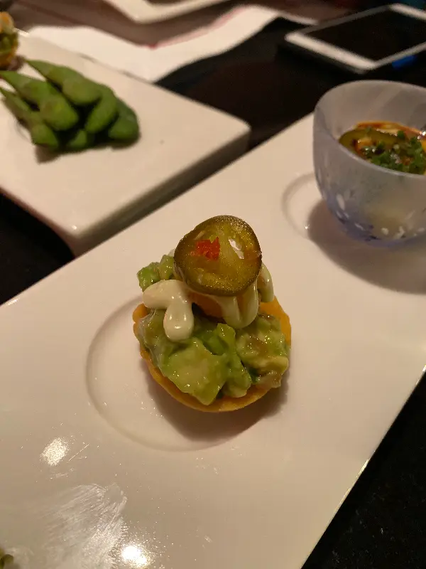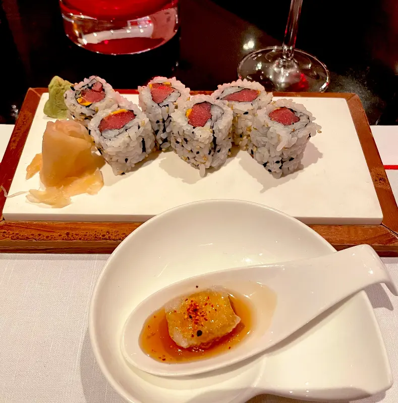 와사비에 대한 기대감은 상당했습니다. 타지마할 팰리스 호텔 내에 위치한 명성, 그리고 뭄바이 최고의 정통 스시를 제공한다는 이야기는 방문 전부터 마음을 설레게 했습니다. 자리에 앉자 웨이터가 직접 와사비 뿌리를 들고 와서 상어 가죽에 갈아주는 모습은 그 기대감을 더욱 증폭시켰습니다. 갓 갈아 만든 와사비 페이스트는 시중에서 판매하는 와사비와는 차원이 다른, 깊고 풍부한 매운맛을 선사했습니다. 입안 가득 퍼지는 알싸한 향은 신선함 그 자체였습니다.