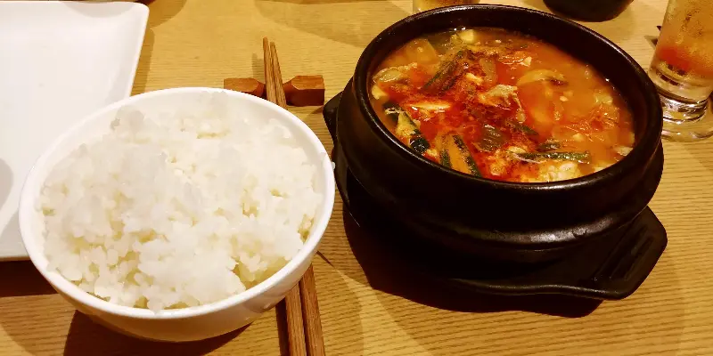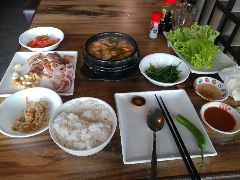 이어서 순두부찌개를 맛보았습니다. 얼큰하고 시원한 국물이 입안 가득 퍼지면서, 인도 음식으로 지쳐있던 입맛을 단번에 되살려주는 듯했습니다. 뚝배기 안에는 순두부와 해산물, 야채 등이 푸짐하게 들어있었습니다. 특히, 갓 지은 따뜻한 밥과 함께 먹으니 더욱 꿀맛이었습니다.