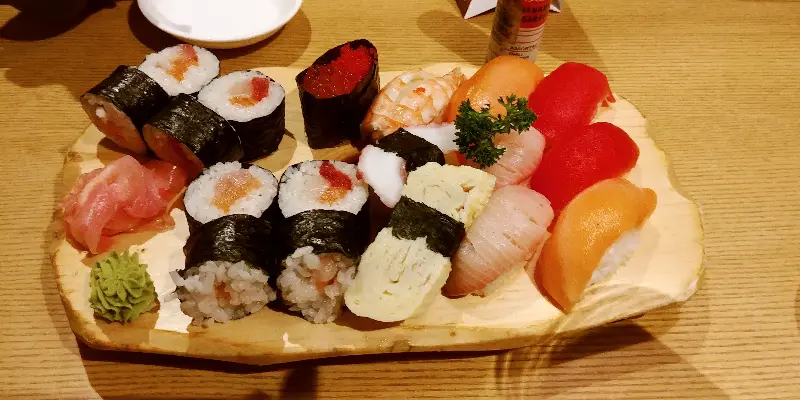 드디어 기다리던 음식이 나왔습니다. 먼저 스시를 맛보았습니다. 한국에서 먹던 것과는 약간 다른 맛이었지만, 신선한 재료와 정갈한 플레이팅이 돋보였습니다.