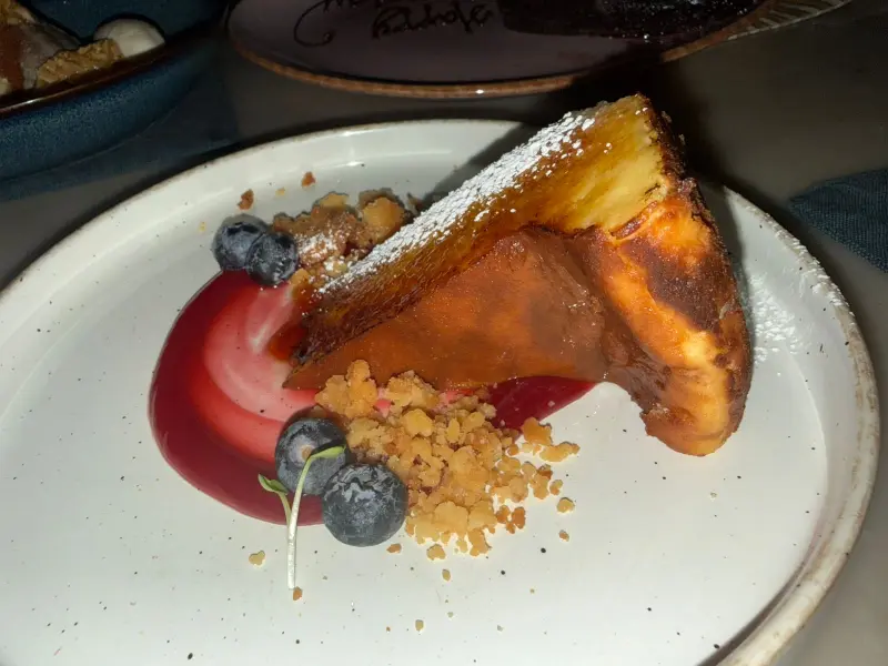 접시 한 켠에 놓인 블루베리와 크럼블은 상큼함과 바삭함을 더해 다채로운 식감을 경험할 수 있게 해주었습니다.