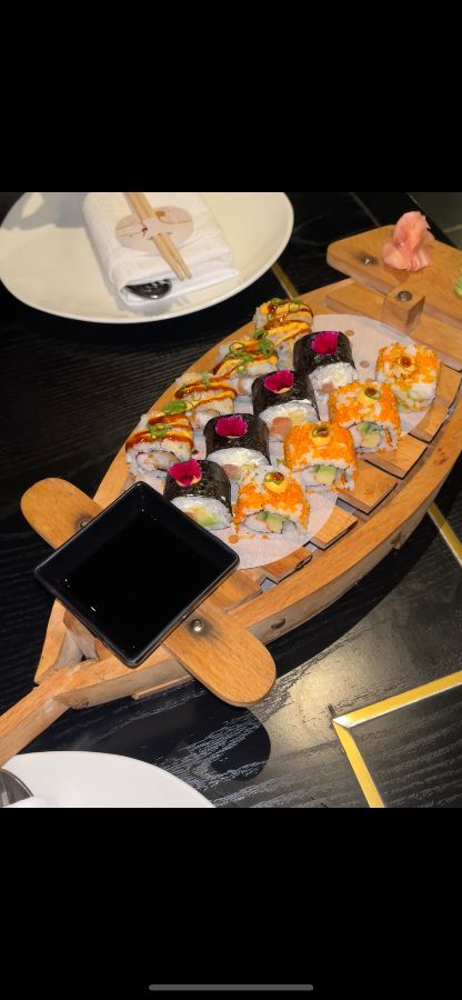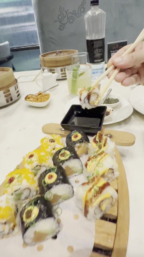 특히 눈길을 사로잡았던 것은 푸짐하게 제공된 스시 보트였습니다. 젓가락으로 집어 올린 스시 한 점은 신선한 재료의 향연이었고, 다채로운 색감의 롤들은 보는 즐거움까지 더해주었습니다. 새우 청펀, 완탕, 새우 버터플라이 등 다양한 전채들이 끊임없이 이어지며 미식의 향연을 펼쳤습니다. 매콤한 고추기름과 상큼한 녹색 소스는 각 요리의 맛을 한층 끌어올리는 완벽한 파트너였습니다.