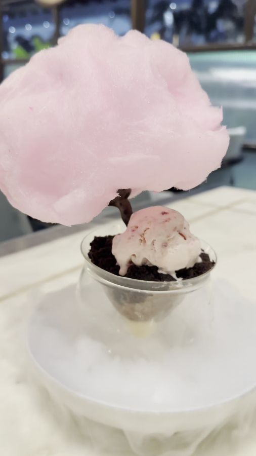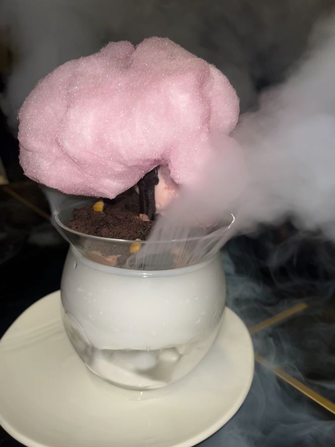 풍성한 메인 요리를 마친 후, 달콤한 디저트 코스는 식사의 완벽한 마침표를 찍었습니다. 뷔페에는 다양한 디저트가 있었지만, 특히 베리 포레스트 디저트는 그야말로 압권이었습니다. 투명한 유리 볼 안에 솜사탕으로 만들어진 분홍빛 나무가 서 있고, 그 아래에는 초콜릿 크럼블 흙 위에 탐스러운 베리들이 자리 잡고 있었습니다. 여기에 드라이아이스 연출이 더해져 신비로운 안개가 피어오르자, 테이블은 순식간에 동화 속 숲으로 변했습니다.