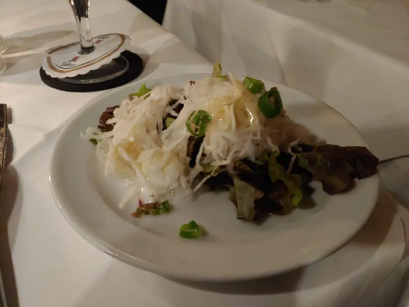 잠시 후, 드디어 기다리고 기다리던 학센이 테이블 위에 놓였다. 겉은 바삭하게 튀겨지고 속은 촉촉하게 삶아진 학센은, 그 웅장한 자태만으로도 시선을 압도했다. 겉은 황금빛 갈색으로 윤기가 자르르 흘렀고, 먹기 좋게 잘라진 단면은 촉촉함이 가득했다.