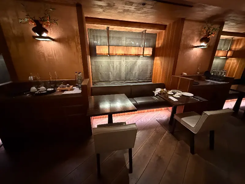 리뷰에 따르면, 다이닝 공간의 테이블이 다소 낡았다는 의견도 있지만, 전반적으로 훌륭한 분위기를 자랑합니다. 은은한 조명 아래 펼쳐진 테이블 세팅은 곧 마주할 미식 경험에 대한 기대를 높여줍니다.
