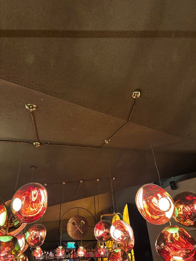 레스토랑 내부는 붉은빛 조명이 은은하게 비추는 세련된 분위기였습니다. 특히 천장에 매달린 독특한 모양의 조명들이 눈길을 끌었죠. 웅장한 느낌을 주는 구형 구조물들은 이탈리아 현지에 와 있는 듯한 착각을 불러일으키기도 했습니다.