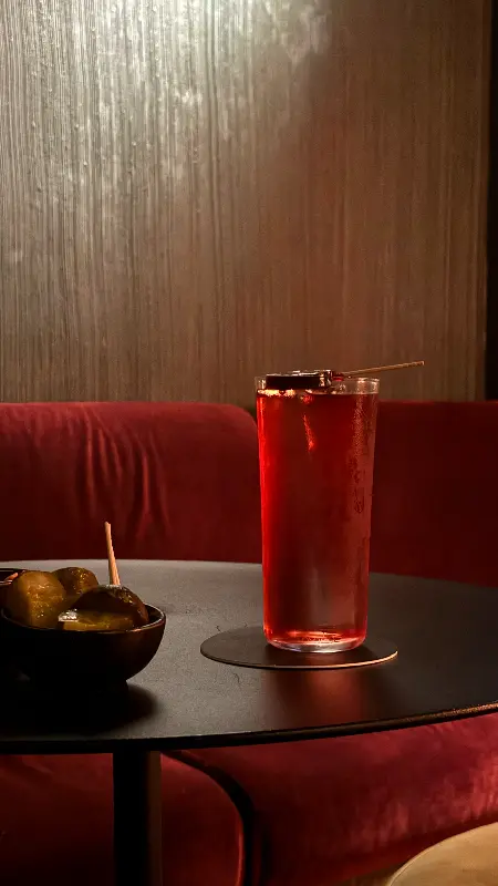 붉은색 칵테일과 올리브는 완벽한 조화를 이루며, 미각을 자극합니다.