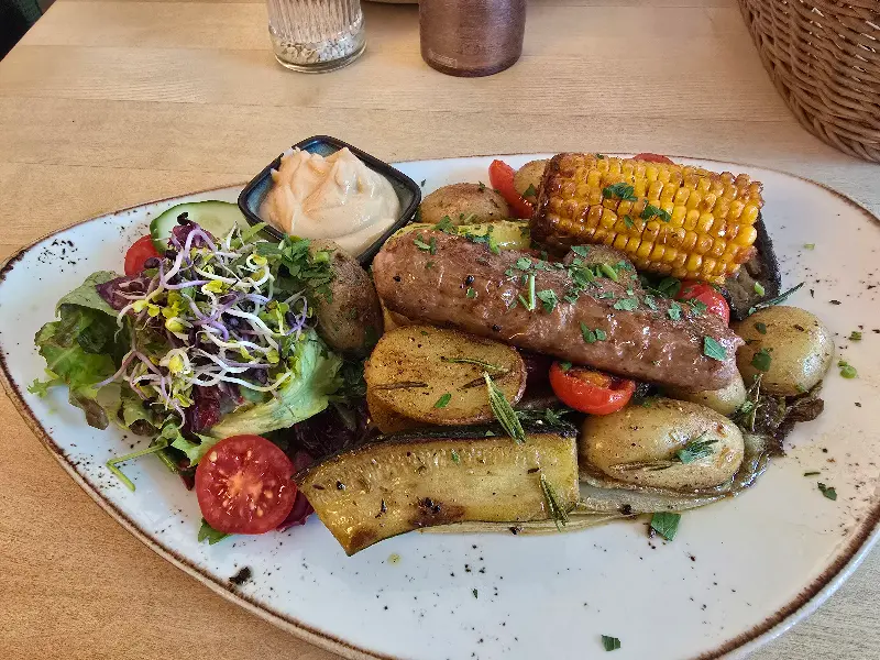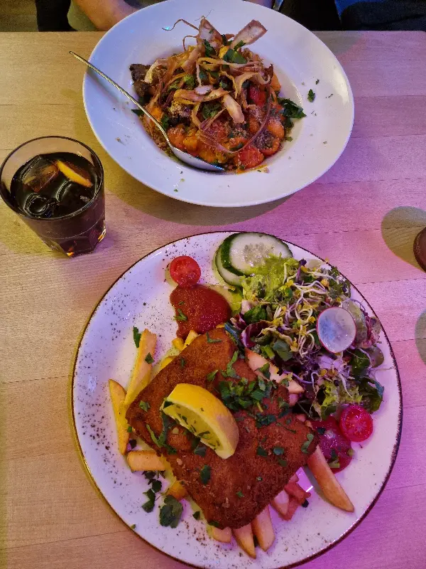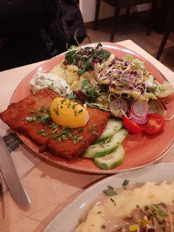 주문한 슈니첼이 테이블에 놓이는 순간, 눈을 뗄 수 없는 비주얼에 감탄했다. 겉은 바삭하고 속은 촉촉한 슈니첼은 튀김옷의 황금빛 색감과 신선한 채소들의 조화가 완벽했다. 한 입 베어 무니, 바삭한 튀김옷과 촉촉한 식감이 입안 가득 퍼져 나갔다. 특히, 비건이라고는 믿기지 않을 정도로 풍부한 맛과 향이 인상적이었다. 함께 제공된 소스 또한 슈니첼의 풍미를 더욱 깊게 만들어주었다.
