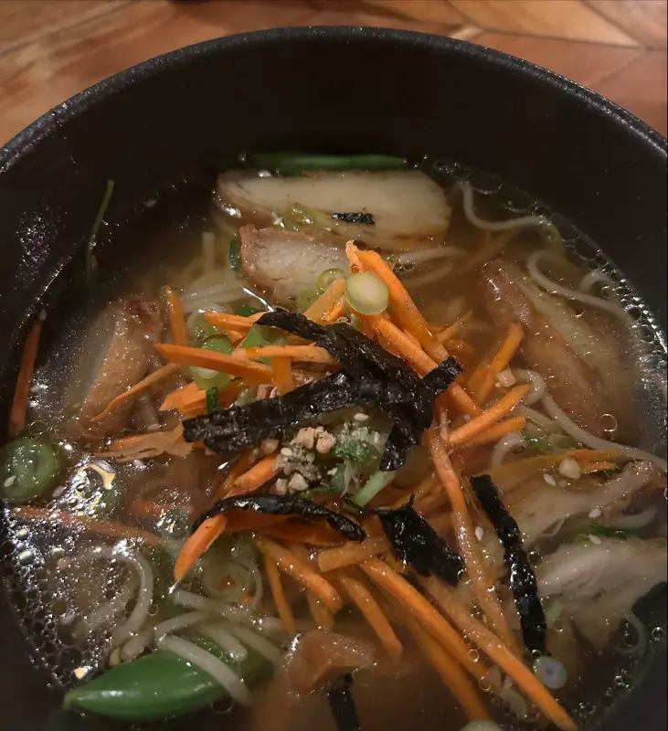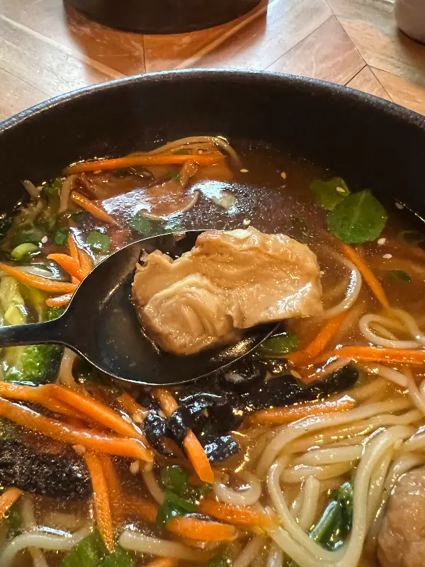우선, 쫄깃한 면발과 깊은 국물 맛이 일품인 우동은 추운 날씨에 몸을 녹여주는 완벽한 선택이었습니다. 신선한 채소가 듬뿍 들어가 있어 건강한 느낌을 더했습니다.