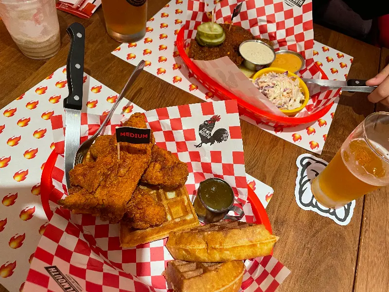 주문 후, 가게 안을 둘러봤다. 테이블마다 놓인 빨간색 체크무늬 트레이 페이퍼와 강렬한 붉은색 로고가 인상적이었다. 곧이어 등장한 치킨. 튀김옷 위에 뿌려진 붉은색 향신료가 ‘이것이 바로 Hot 단계구나!’라고 외치는 듯했다.