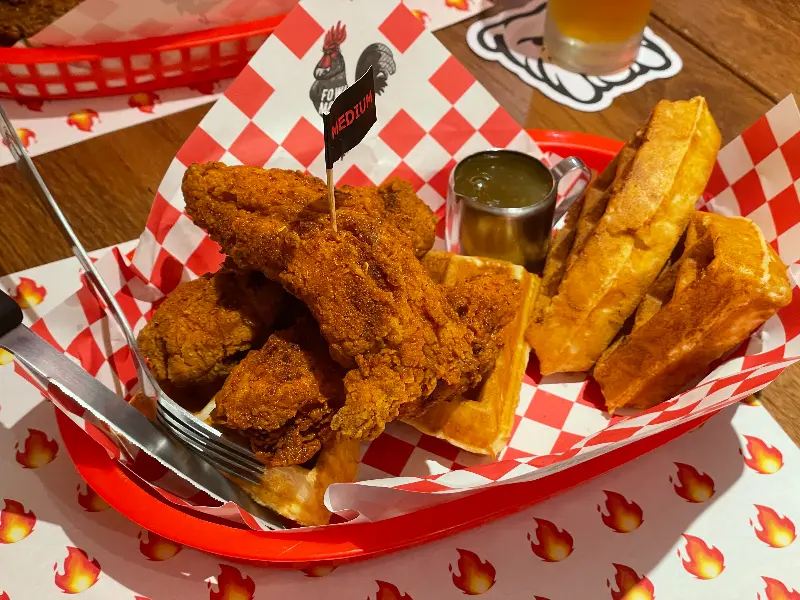 메뉴판을 펼치니 다양한 종류의 치킨과 버거가 눈에 들어왔다. 예전에 호주에서 먹었던 매콤한 치킨의 추억을 떠올리며, ‘매콤’이라는 단어에 집중하기 시작했다. 리뷰들을 살펴보니 맵기 조절이 가능하다는 정보를 입수! Medium과 Hot 단계를 고민하다가, 모험심을 발휘해 Hot 단계를 주문해 보기로 했다.