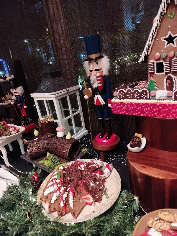 크리스마스 분위기가 물씬 풍기는 테이블, 달콤한 디저트가 가득