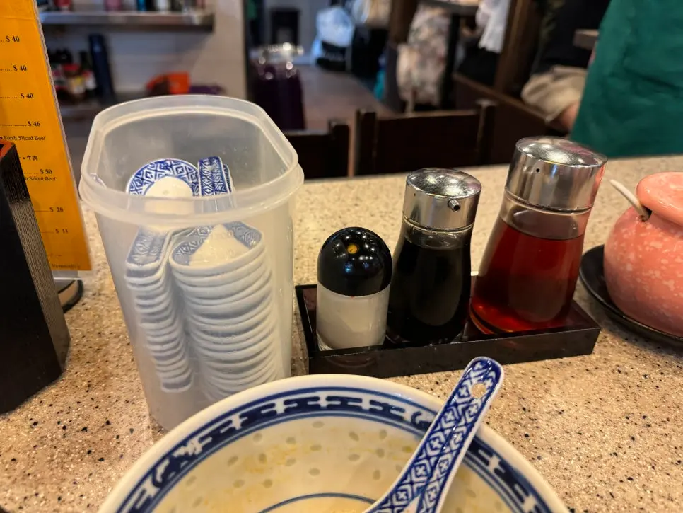 주문한 음식이 나오기 전에 테이블을 둘러보니, 간장, 고추기름 등 다양한 양념통이 가지런히 놓여 있다. 뽀얀 도자기 그릇에 담긴 수저통에는 젓가락과 함께 독특한 디자인의 숟가락이 담겨 있었다.