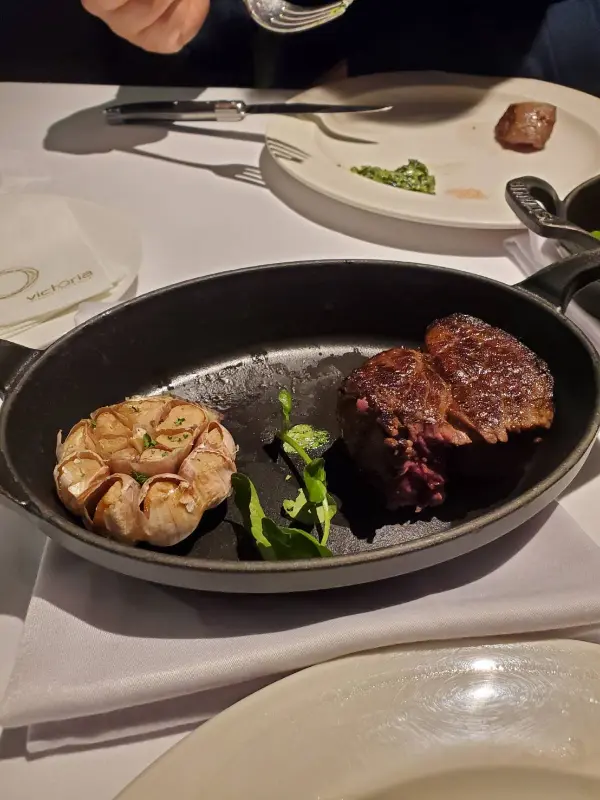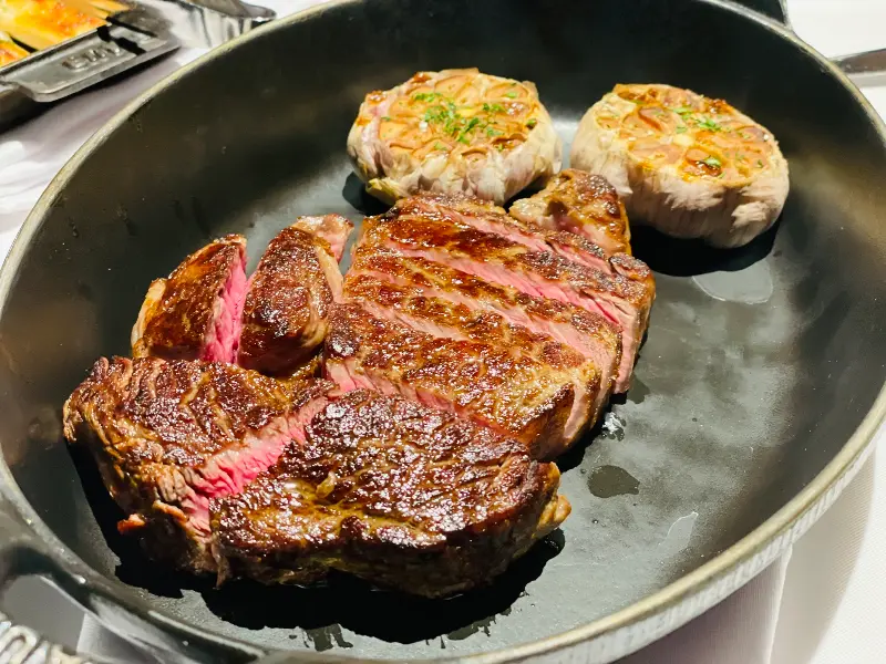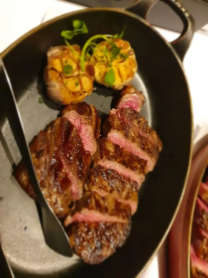 드디어 테이블에 놓인 F1 필레미뇽은 기대 이상의 풍미를 자랑했다. 한 입 베어 무는 순간, 입 안에서 사르르 녹아내리는 듯한 부드러움에 감탄했다. 겉은 바삭하게 익혀져 있었지만, 속은 촉촉함을 그대로 유지하고 있었다. 함께 제공된 구운 마늘은 너무 작아서 떠먹기가 조금 어려웠지만, 스테이크의 풍미를 더욱 깊게 만들어주는 역할을 했다. 남편이 주문한 미국산 립아이 역시 훌륭했다. 립아이는 F1 필레미뇽보다 식감이 더 좋았고, 로스팅 향이 풍부했지만 기름기는 덜한 것 같았다.