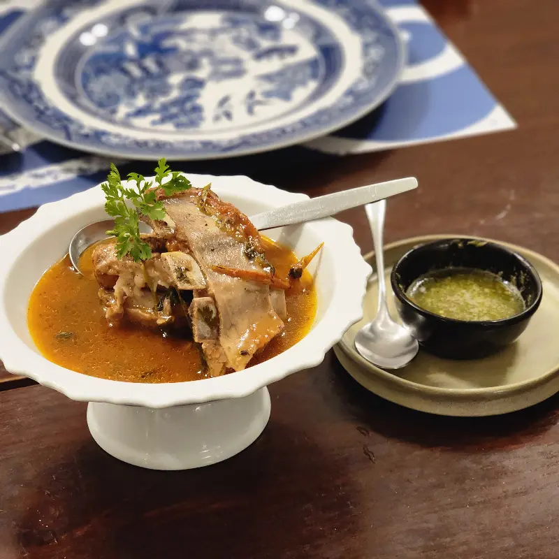가장 먼저 나온 음식은 바로 와인 소스 돼지갈비찜이었습니다. 붉은 빛깔의 윤기 흐르는 갈비찜은 보기만 해도 군침이 돌았습니다. 한 입 맛보는 순간, 입 안에서 살살 녹는 부드러운 식감에 감탄했습니다. 와인 소스의 풍미는 한국의 갈비찜과 비슷하면서도, 묘하게 태국적인 향신료의 향이 느껴져 더욱 특별했습니다. 특히 매콤한 소스를 곁들여 먹으니, 느끼함은 싹 가시고 입맛을 돋우는 매콤함이 더해져 더욱 맛있었습니다.