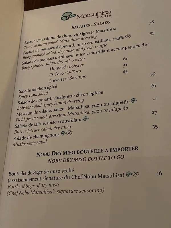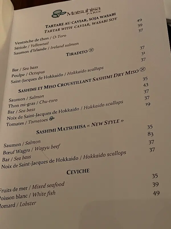 마츠히사 파리에서는 다양한 메뉴를 맛볼 수 있지만, 특히 스시는 꼭 경험해야 할 필수 코스입니다. 한 입 베어 물 때마다 느껴지는 신선함과 풍미는, 왜 이곳이 파리 최고의 스시 맛집으로 손꼽히는지 단번에 이해시켜 줍니다. 특히 방어와 문어 카르파초는 신선한 재료 본연의 맛을 극대화한 요리로, 입안 가득 퍼지는 풍미가 잊을 수 없는 경험을 선사합니다. 또 다른 고객은 “스시롤은 전설적이고, 튀김은 환상적이며, 생선 요리는 그야말로 최고”라며 극찬했습니다. 신선한 재료와 노부 셰프만의 독창적인 레시피가 만들어낸 환상적인 맛의 조화는, 미식가들의 입맛을 사로잡기에 충분합니다.