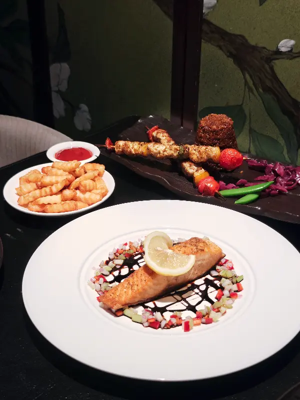 메인 요리로는 모로칸 치킨 시가와 구운 연어를 주문했다. 모로칸 치킨 시가는 바삭한 튀김 옷 안에 촉촉한 닭고기가 가득 들어 있어 겉바속촉의 정석을 보여주었다. 은은하게 퍼지는 향신료 향은 이국적인 풍미를 더했고, 함께 제공된 소스와의 조화도 훌륭했다. 구운 연어는 겉은 바삭하고 속은 촉촉하게 구워져 나왔다. 신선한 연어의 풍미가 입안 가득 퍼졌고, 레몬 소스가 느끼함을 잡아주어 더욱 맛있게 즐길 수 있었다. 마치 지중해 연안의 어느 레스토랑에 와 있는 듯한 기분이었다.