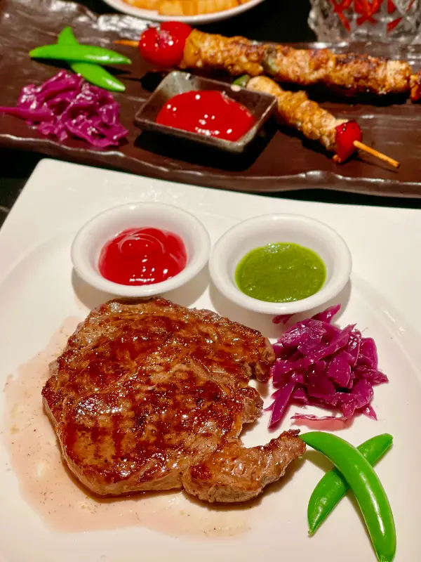 가장 먼저 맛본 것은 메제 플래터였다. 병아리콩 퓌레, 매콤한 토마토 퓌레, 잘게 썬 채소, 리코타 소스 등 네 가지 앙증맞은 퓨레가 한 접시에 담겨 나왔다. 특히 인상 깊었던 것은 후무스였다. 부드럽고 고소한 맛이 일품이었고, 피타 빵에 곁들여 먹으니 풍미가 더욱 살아났다. 매콤한 토마토 퓌레는 입안을 깔끔하게 정리해 주는 역할을 했고, 신선한 채소는 아삭한 식감을 더했다. 메제 플래터는 다채로운 맛과 향을 경험할 수 있는 훌륭한 선택이었다.