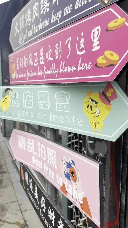재미있는 안내 표지판, ‘구이 핫팟 & 바비큐’로 향하는 길을 안내합니다.