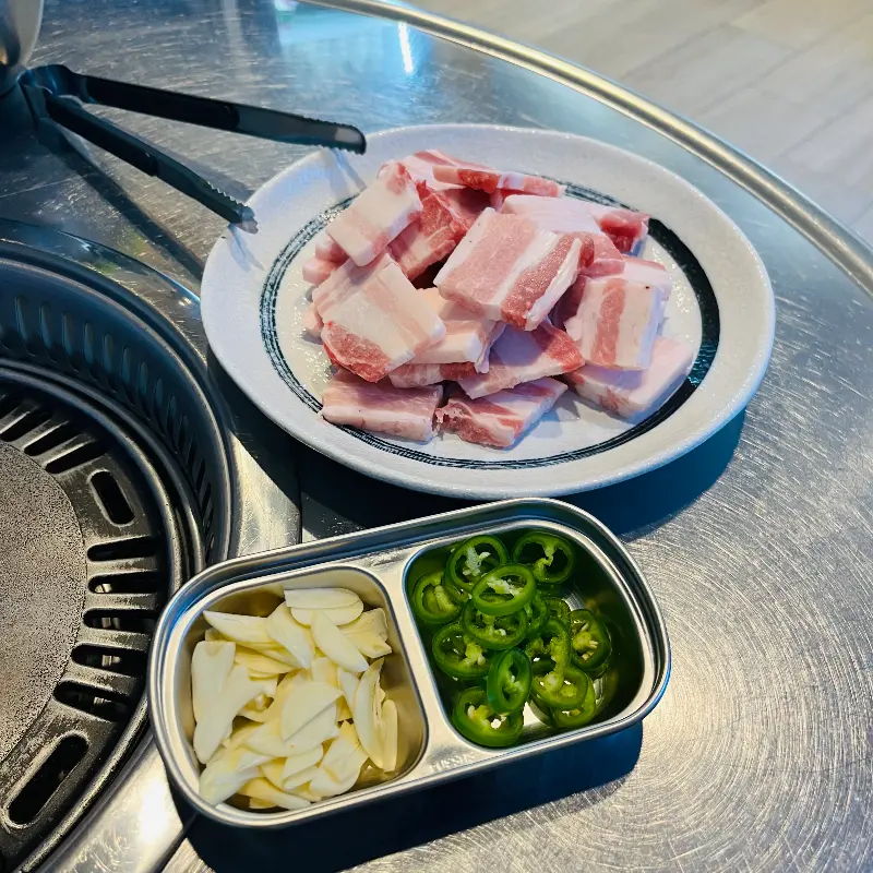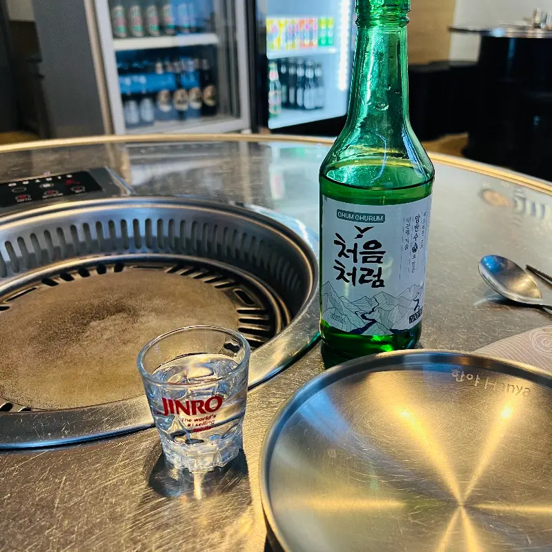 불판 옆에 놓인 초록색 소주병은 그 자체로 향수를 불러일으켰다. 투명한 소주잔에 찰랑이는 술을 채워 단숨에 들이켰다. 쌉쌀하면서도 시원한 맛이 목을 타고 넘어가는 순간, 고된 하루의 피로가 씻겨 내려가는 듯했다. 역시 한국 음식에는 소주가 빠질 수 없지. 이미지 속 스테인리스 테이블과 은색 숟가락, 그리고 ‘안아주세요’라고 적힌 냅킨마저 정겹다.