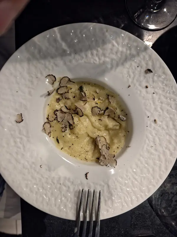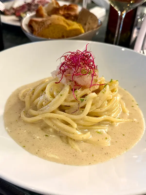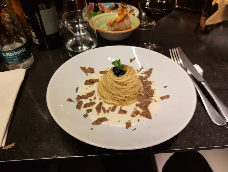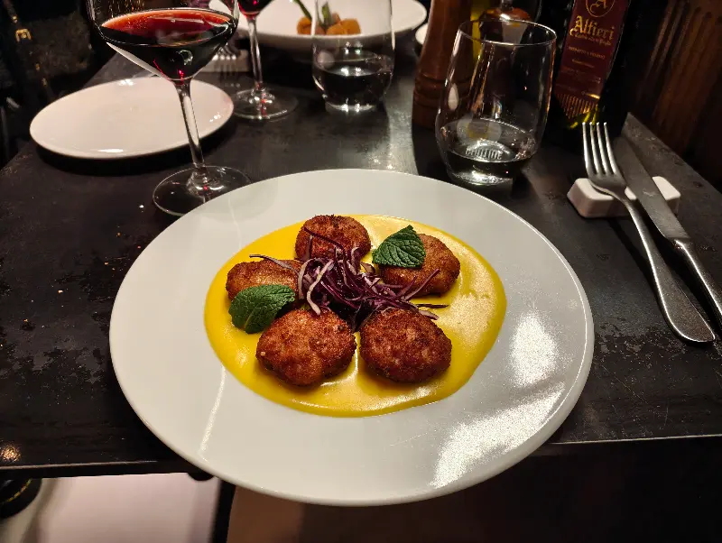 저는 이곳의 대표 메뉴인 프랄리네 디 바칼라(Praline di Baccalà)를 주문했습니다. 바삭한 겉면과 촉촉한 속살이 환상적인 조화를 이루는 이 요리는, 입안에서 사르르 녹아내리는 듯한 식감이었습니다. 짭짤하면서도 고소한 맛이 일품이었고, 와인과 함께 곁들이니 풍미가 더욱 살아났습니다.