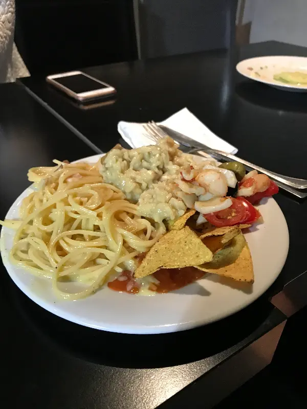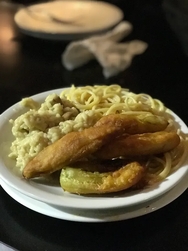 다양한 파스타와 튀김 요리가 한 접시에 담겨 풍성함을 더한다.