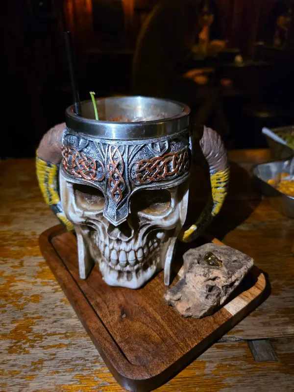 해골 모양 잔에 담긴 칵테일은 강렬한 비주얼로 시선을 사로잡는다.