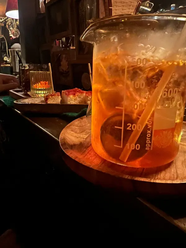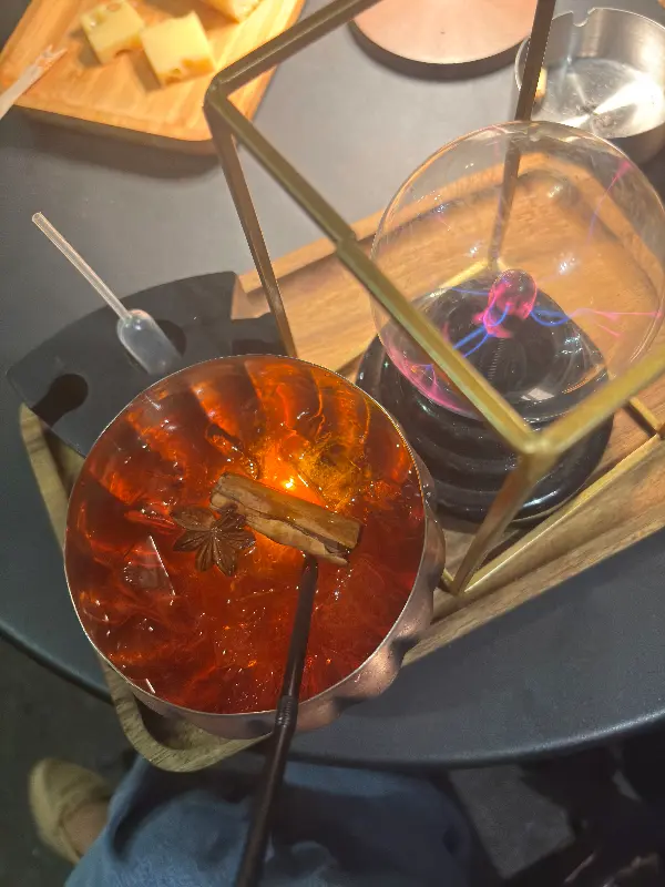 노팅엄 포레스트에서 가장 인상 깊었던 칵테일은 “One Drink with Balls”와 “Dr. Jekyll”이었다. “One Drink with Balls”는 이름처럼 공 모양의 얼음이 들어간 칵테일이었는데, 톡톡 터지는 식감과 상큼한 맛이 조화롭게 어우러져 독특한 경험을 선사했다. “Dr. Jekyll”은 마치 실험 도구처럼 생긴 잔에 담겨 나왔는데, 칵테일을 마시는 동안 잔에서 연기가 피어오르는 모습이 매우 흥미로웠다.