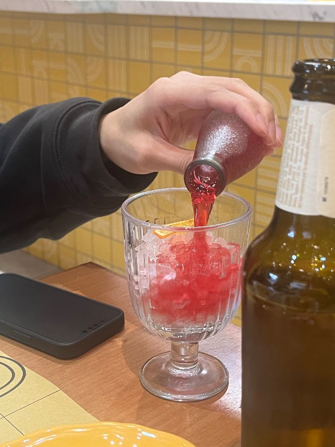 또한, 이곳은 탄산수와 물을 셀프로 무료 제공하여 손님들의 편의를 높입니다. 유럽 여행 중 물값을 따로 지불해야 하는 경우가 많은데, VIA PASTERIA의 이러한 서비스는 방문객들에게 큰 만족감을 줍니다. 시원한 탄산수나 물은 짭조름한 파스타와 완벽한 궁합을 이루며, 식사의 즐거움을 배가시킵니다. 심지어 붉은색 탄산음료와 얼음을 컵에 직접 따라 마시는 사진은 자유롭고 편안한 분위기를 보여주며, 방문객들이 이곳에서 얼마나 즐거운 시간을 보낼 수 있는지 짐작하게 합니다.