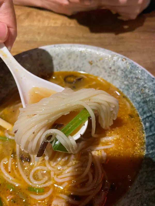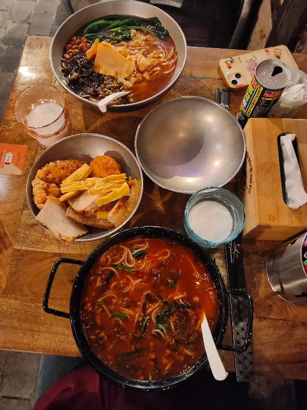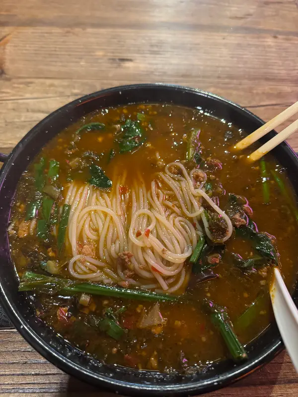 드디어 기다리던 윈난 특선 국수가 나왔다. 검은색 그릇에 담긴 국수는 보기만 해도 군침이 돌았다. 붉은 빛깔의 국물 위로 고기, 채소, 팥 등이 푸짐하게 올려져 있었다. 코를 찌르는 매콤한 향이 식욕을 자극했다. 젓가락으로 면을 휘저어 국물과 함께 한 입 맛보니, 살짝 새콤하면서도 깊은 맛이 느껴졌다. 특히 팥이 들어가 있어 독특한 풍미를 더했다.