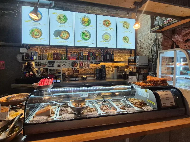 식당 내부는 생각보다 아담하고 소박했다. 나무 테이블과 의자가 정갈하게 놓여 있었고, 벽에는 류저우의 풍경 사진들이 걸려 있었다. 은은하게 풍기는 돼지고기 냄새와 해산물 향이 묘하게 섞여 독특한 분위기를 자아냈다. 카운터에서 주문하는 방식이었는데, 직원분은 친절하게 메뉴를 설명해주셨다. 메뉴판을 살펴보니 다양한 종류의 쌀국수가 있었고, 토핑도 추가할 수 있었다.