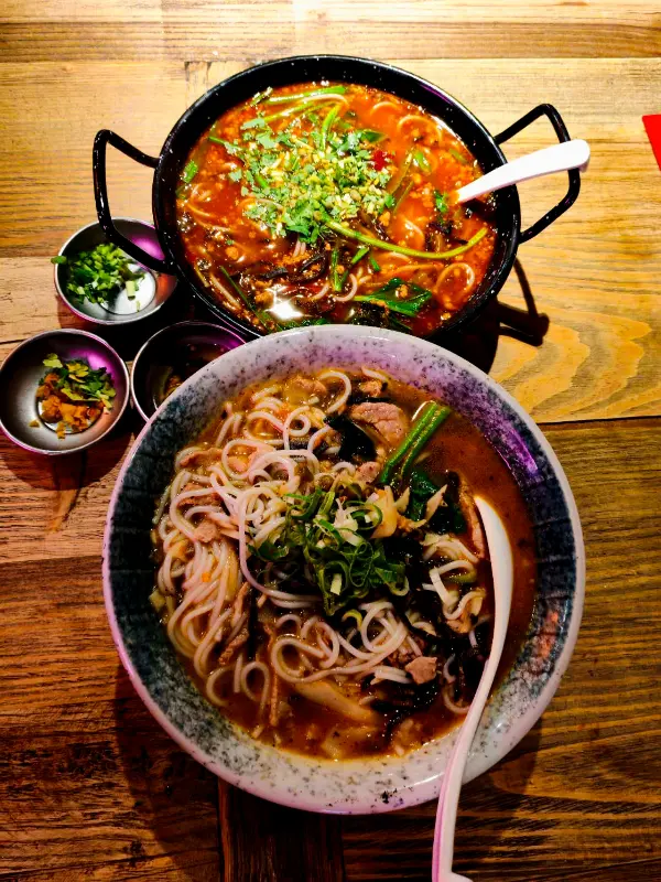 진한 국물과 푸짐한 토핑이 인상적인 윈난 특선 국수. 매콤한 향이 식욕을 자극한다.