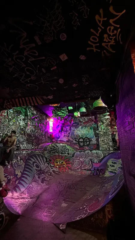 네버마인드 펍의 첫인상은 강렬했다. 낡은 듯 빈티지한 인테리어는 스케이트보드 컨셉과 절묘하게 어우러져 독특한 분위기를 자아냈다. 천장에는 스케이트보드가 매달려 있고, 벽에는 형형색색의 그래피티와 스티커, 낙서들이 빼곡하게 채워져 있었다. 마치 젊음의 에너지와 반항 정신을 시각적으로 표현한 듯했다.