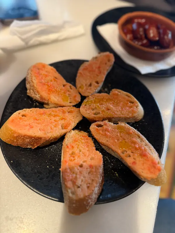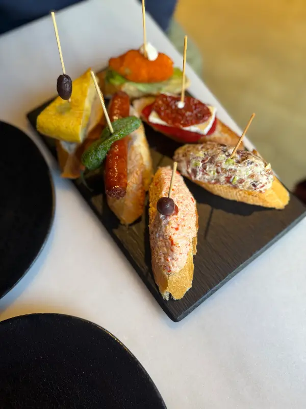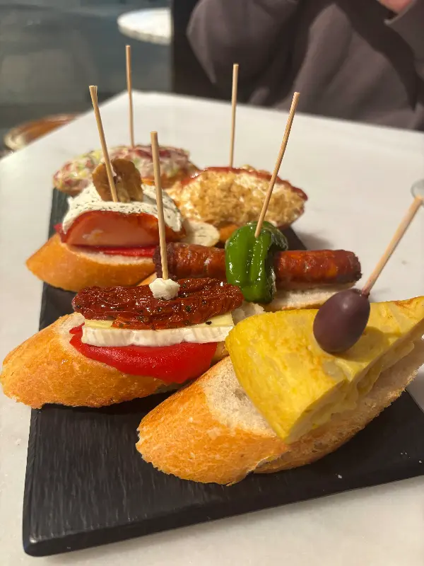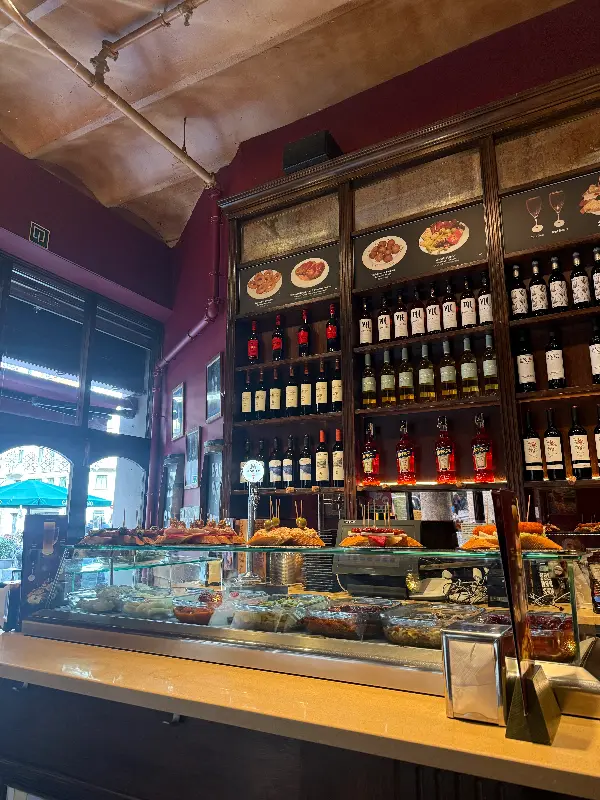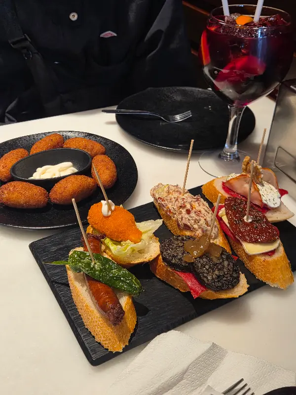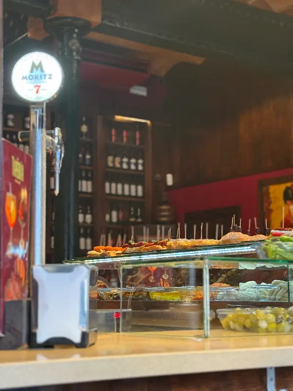 문을 열고 들어서는 순간, 활기찬 에너지가 온몸을 감쌌습니다. 아담한 공간은 정겨운 분위기로 가득했고, 직원들의 밝은 미소는 여행의 피로를 잊게 해주었습니다. 나무로 만들어진 바 테이블 위에는 형형색색의 타파스가 보기 좋게 진열되어 있었고, 벽면에는 스페인 전통 문양이 그려져 있어 현지의 정취를 물씬 느낄 수 있었습니다. 붉은색 벽과 은은한 조명은 아늑함을 더했고, 마치 오랜 친구 집에 방문한 듯 편안한 기분이 들었습니다.