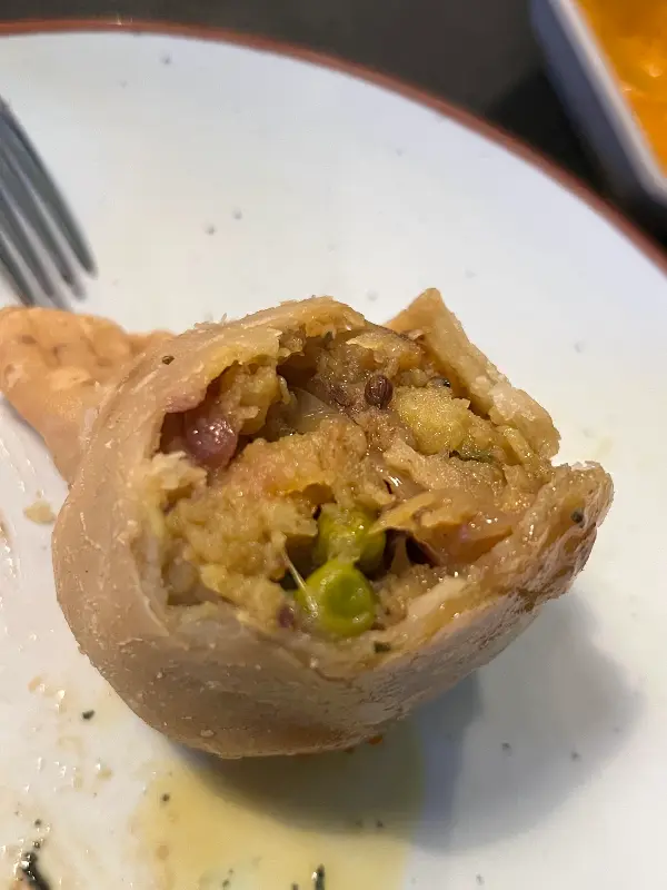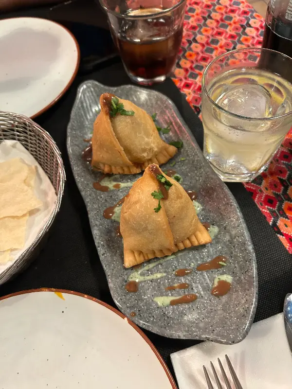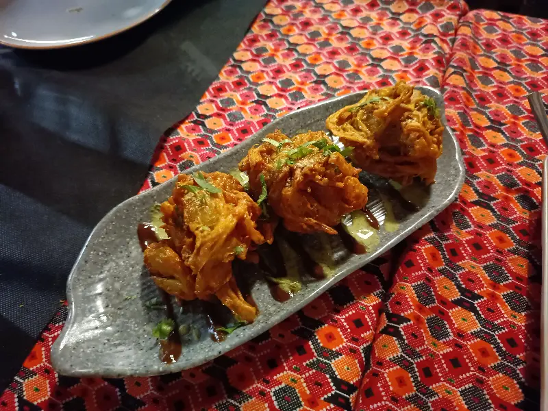 가장 먼저 나온 것은 어니언 바지였다. 튀김옷은 바삭하고 양파는 촉촉한, 완벽한 조화를 이룬다. 은은하게 풍기는 향신료 향은 입맛을 돋우기에 충분했다. 테이블의 붉은색 패턴과 회색 접시의 조화가 음식의 먹음직스러움을 한층 더 돋보이게 한다.