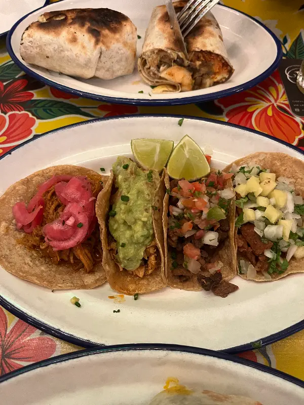 메뉴를 펼쳐 들자, 다채로운 멕시코 요리들이 눈길을 사로잡습니다. 타코, 부리또, 퀘사디아 등 클래식한 메뉴부터 케사비리아, 아레체라 등 Rosa Negra만의 특별한 메뉴까지, 선택의 폭이 넓어 무엇을 먹을지 한참을 고민하게 됩니다. 고민 끝에, 그릴드 비프 타코와 치킨 퀘사디아, 그리고 Rosa Negra의 대표 메뉴인 부리또를 주문했습니다.